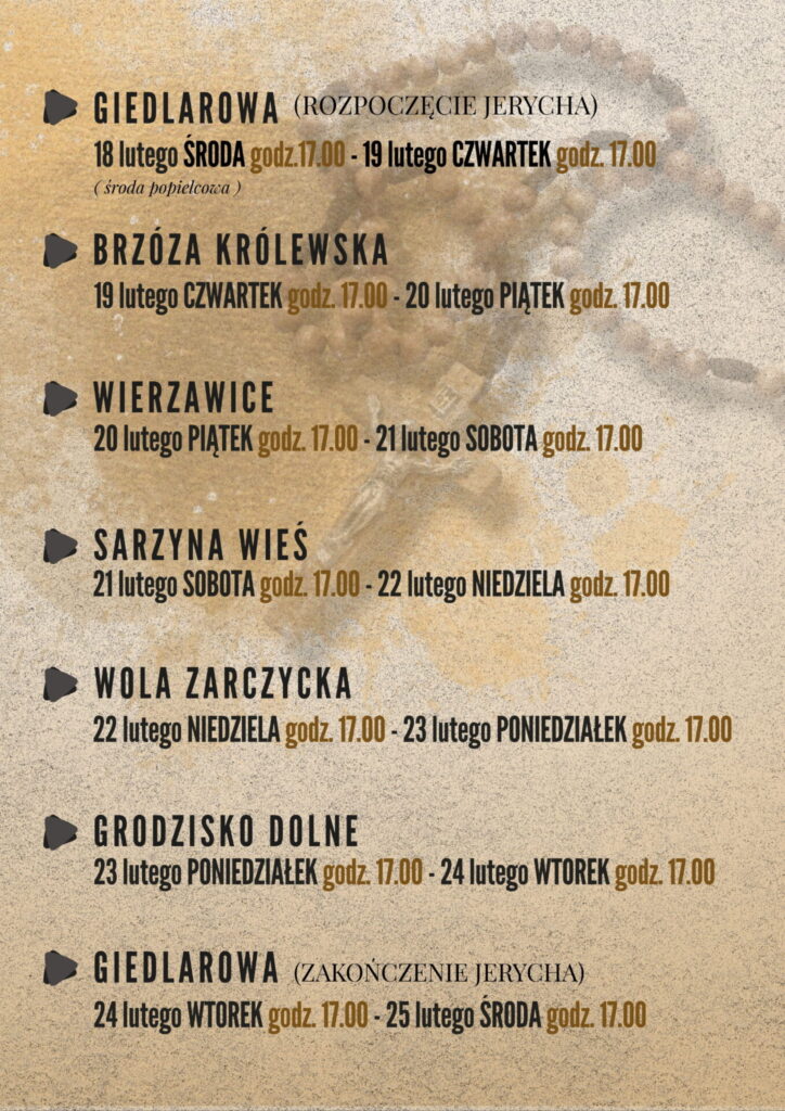 - W dniach 19/20 w naszej Parafii od gdz.17.00 do 17.00 następnego dnia (doba) będzie miała miejsce modlitwa w ramach „Jerycha różańcowego”. Intencje: w intencji rodzin naszej Parafii; o pokój w Polsce i na świecie; w intencji renowacji misji św. oraz powołania do grup Parafialnych. W tę modlitwę włącza się siedem miejscowości naszego rejonu. Na czym polega? Przez godzinę wobec Najświętszego Sakramentu jedna grupa odmawia różaniec. (Cztery części może być z rozważaniami) Zapraszamy na tę modlitwę wszystkich ale prosimy aby zadeklarowali się na poszczególne godziny jakby odpowiedzialni, którzy poprowadzą. Listy do zapisu są u p. Kościelnego. Ci którzy czytają Nasz Dziennik czy słuchają Radia Maryja orientują się co to jest Jerycho Różańcowe. Zapraszamy do udziału KSM, AK, Ministrantów, Scholę, Radę Parafialną i grupy Żywego Różańca. Oczywiście zapraszamy wszystkich do tej modlitwy. Plakat jest na tablicy ogłoszeń , także informacja o tej formie modlitwy. Proszę zobaczyć i przeczytać. Liczę na włączenie się możliwie dużej części Parafian.
